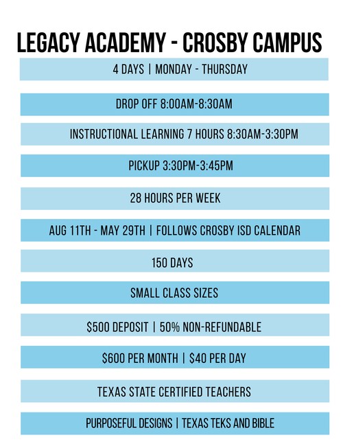 Our Legacy Academy will follow Crosby ISD Calendar and be open Monday - Thursday